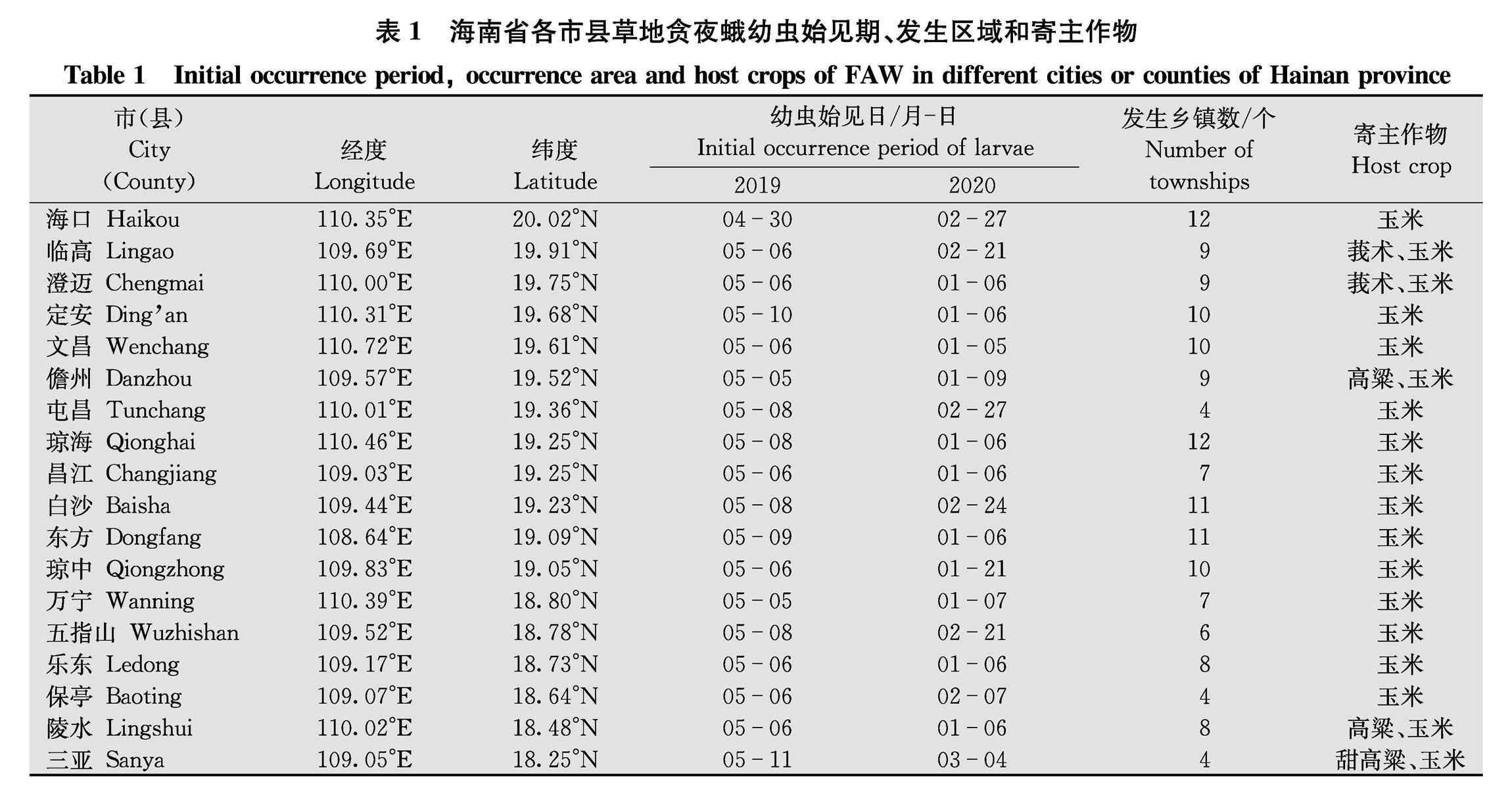 草地贪夜蛾在海南省发生后,迅速扩散,为明确草地贪夜蛾在海南的发生规律,并制定防控策略,本文对2019年4月30日至2020年9月8日全省18个市县草地贪夜蛾幼虫田间发生密度和面积以及成虫灯诱和性诱数据进行了分析。初步得出以下结论,草地贪夜蛾在海南省主要为害的作物为玉米、莪术、高粱和甜高粱,以玉米为主。(剩余10632字)
