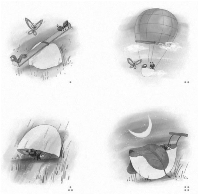 看图,想一想:小虫子、蚂蚁和蝴蝶用鸡蛋壳做了哪些事情?它们有什么有趣的经历?把它们这一天的经历写下来吧!
