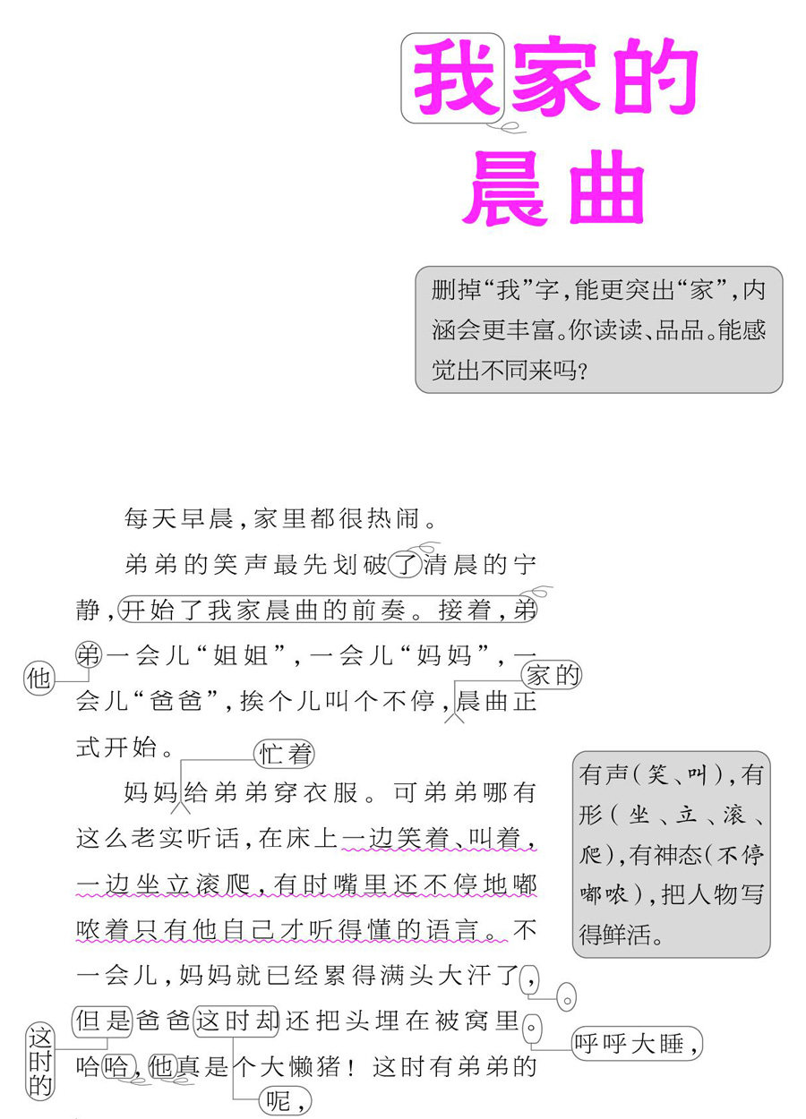 妈妈给弟弟穿衣服。可弟弟哪有这么老实听话,在床上一边笑着、叫着,一边坐立滚爬,有时嘴里还不停地嘟哝着只有他自己才听得懂的语言。不一会儿,妈妈就已经累得满头大汗了,但是爸爸这时却还把头埋在被窝里。(剩余366字)