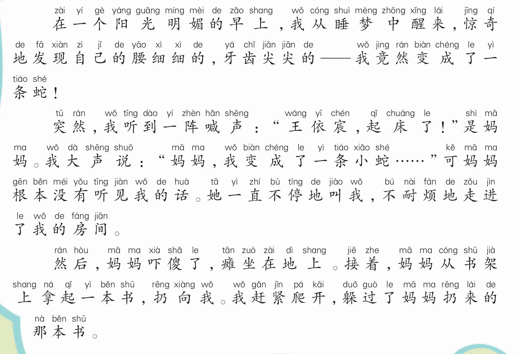 突然,我听到一阵喊声:“王依宸,起床了!”是妈妈。我大声说:“妈妈,我变成了一条小蛇......”可妈妈根本没有听见我的话。她一直不停地叫我,不耐烦地走进了我的房间。
