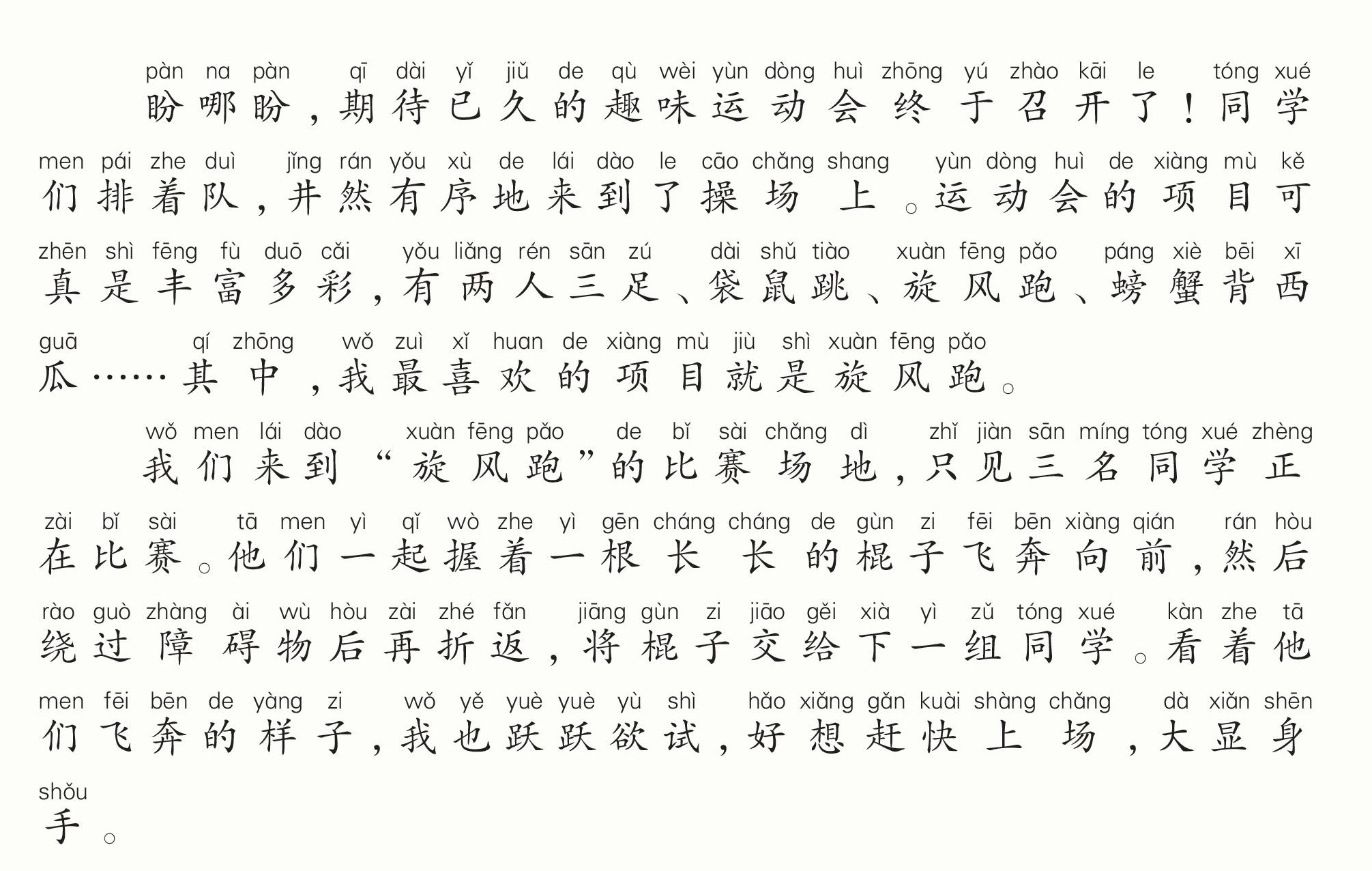 盼哪盼,期待已久的趣味运动会终于召开了!同学们排着队,井然有序地来到了操场上。运动会的项目可真是丰富多彩,有两人三足、袋鼠跳、旋风跑、螃蟹背西瓜......其中,我最喜欢的项目就是旋风跑。(剩余499字)