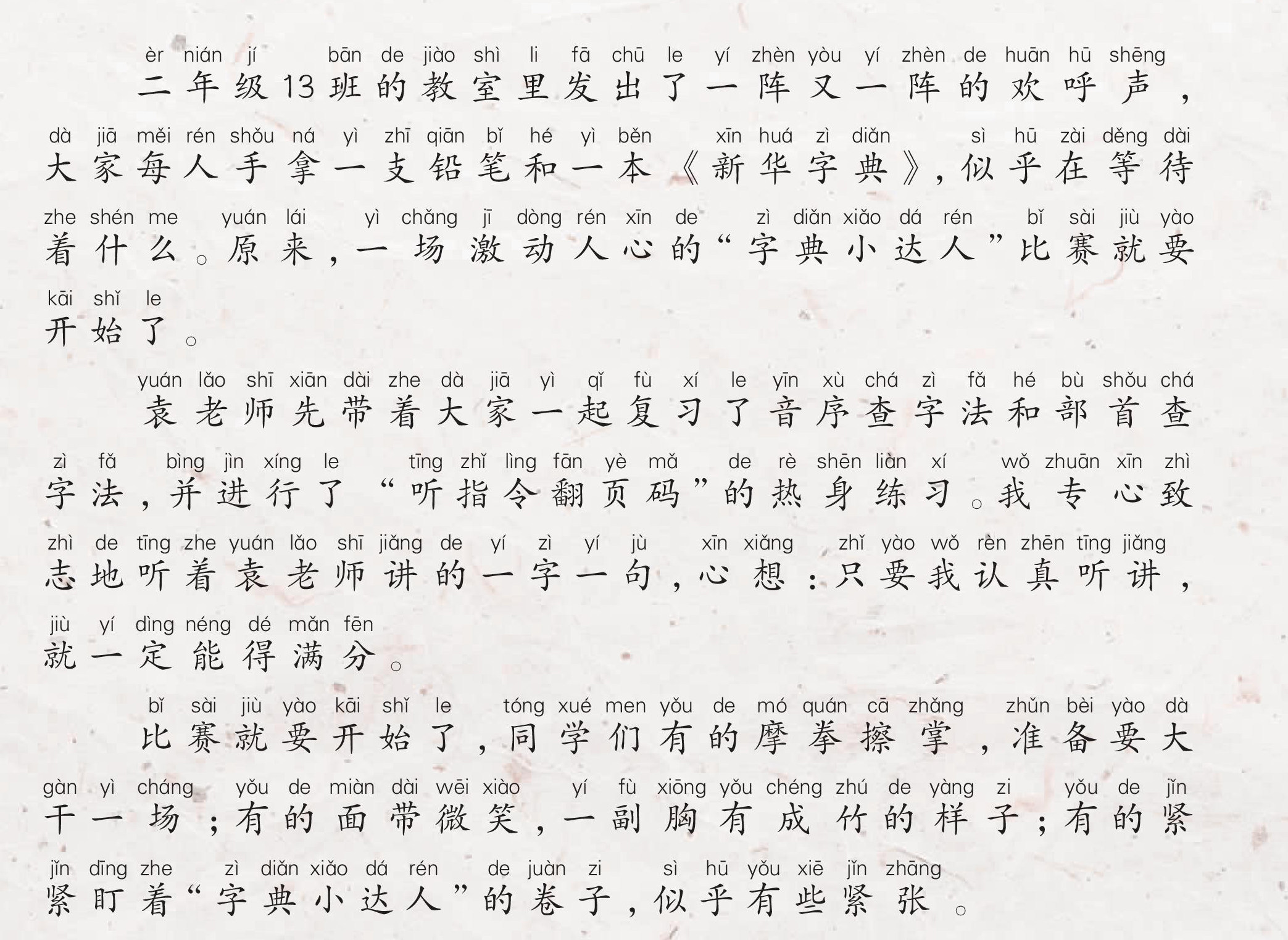 二年级13班的教室里发出了一阵又一阵的欢呼声,大家每人手拿一支铅笔和一本《新华字典》,似乎在等待着什么。原来,一场激动人心的“字典小达人”比赛就要开始了。