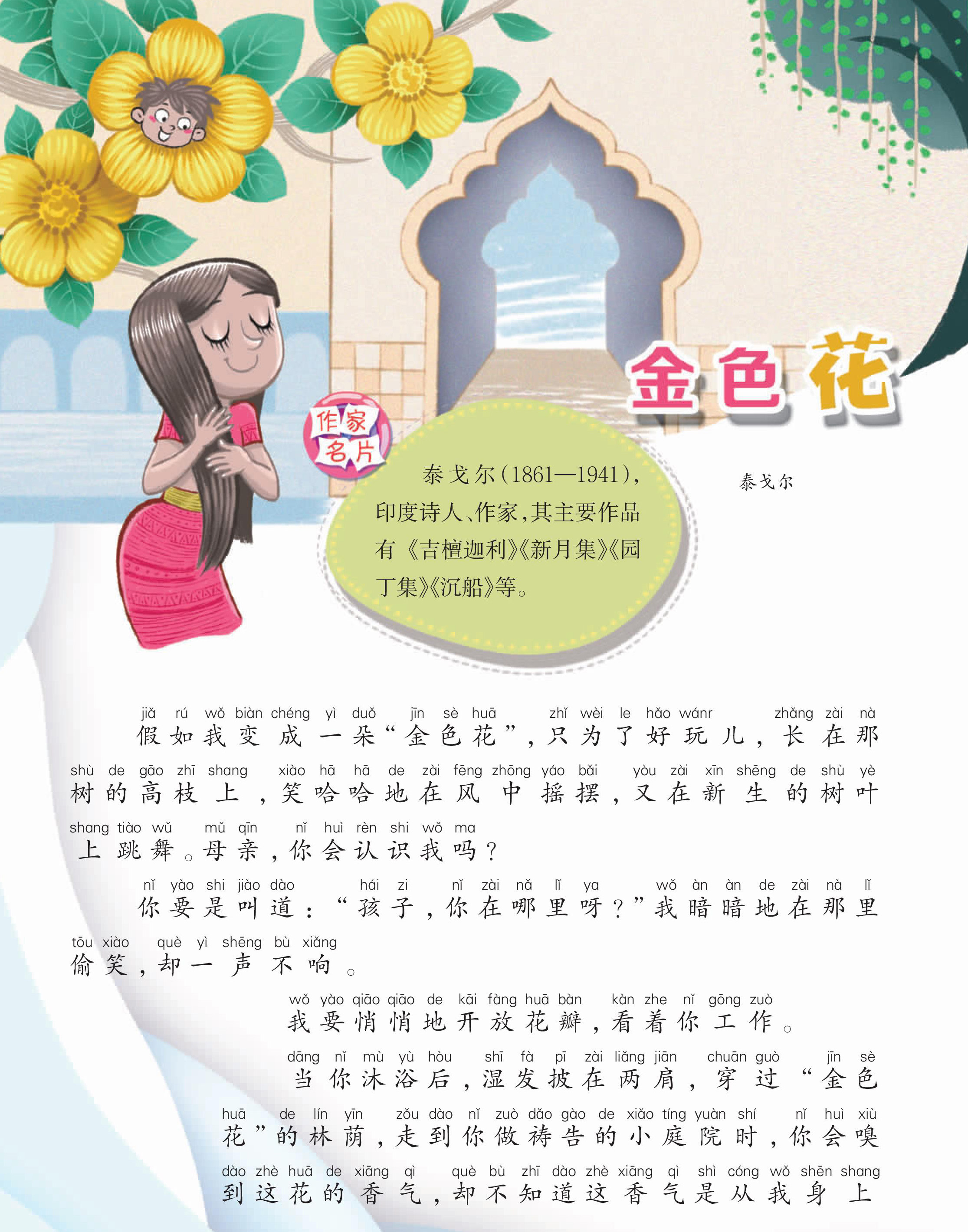 假如我变成一朵“金色花”,只为了好玩儿,长在那树的高枝上,笑哈哈地在风中摇摆,又在新生的树叶上跳舞。母亲,你会认识我吗?