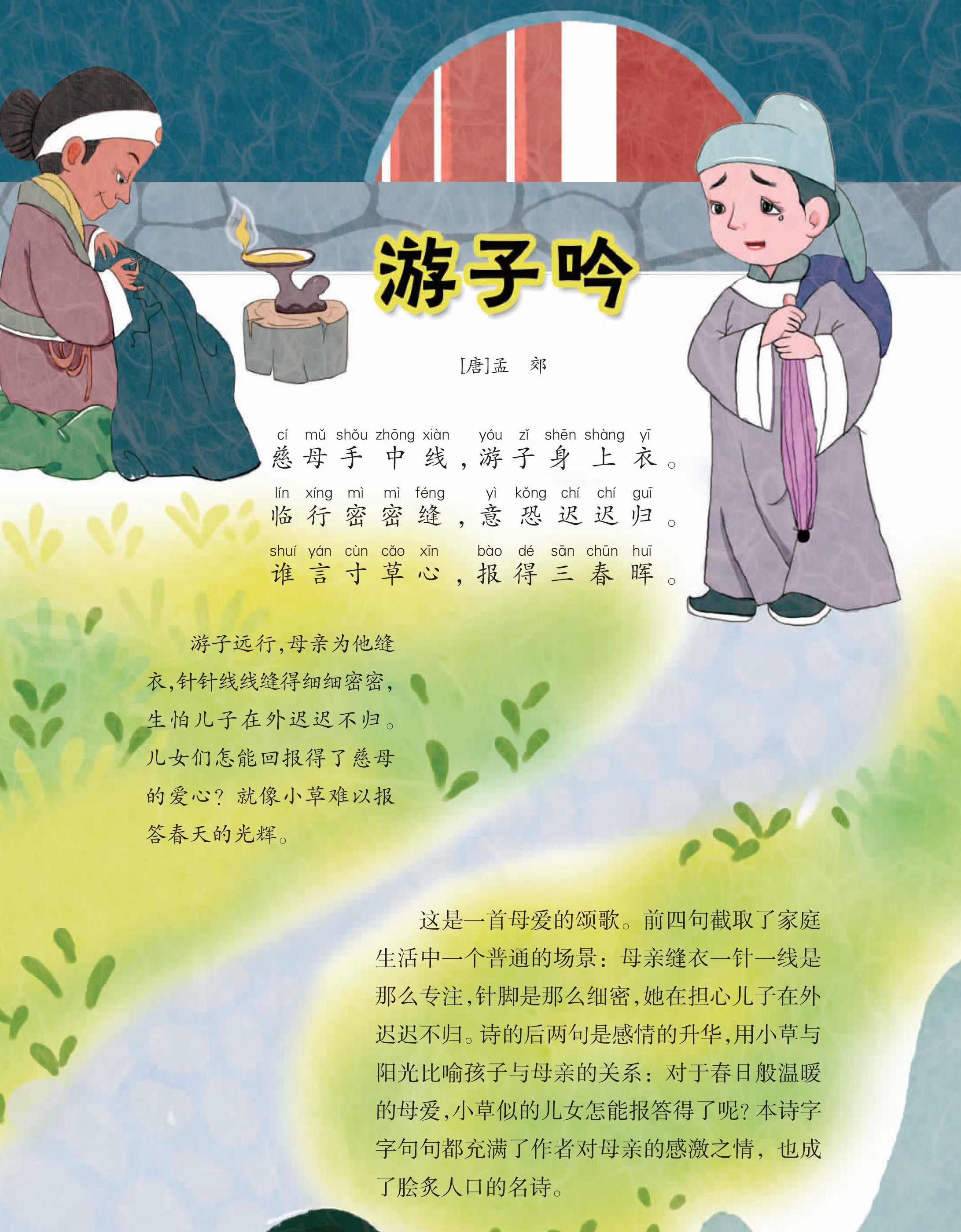 游子远行,母亲为他缝衣,针针线线缝得细细密密,生怕儿子在外迟迟不归。儿女们怎能回报得了慈母的爱心?就像小草难以报答春天的光辉。