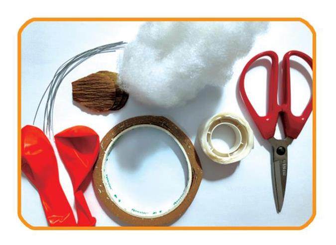 橘色气球、棉絮、铁丝、褶皱纸、棕色胶带纸、双面胶、剪刀。