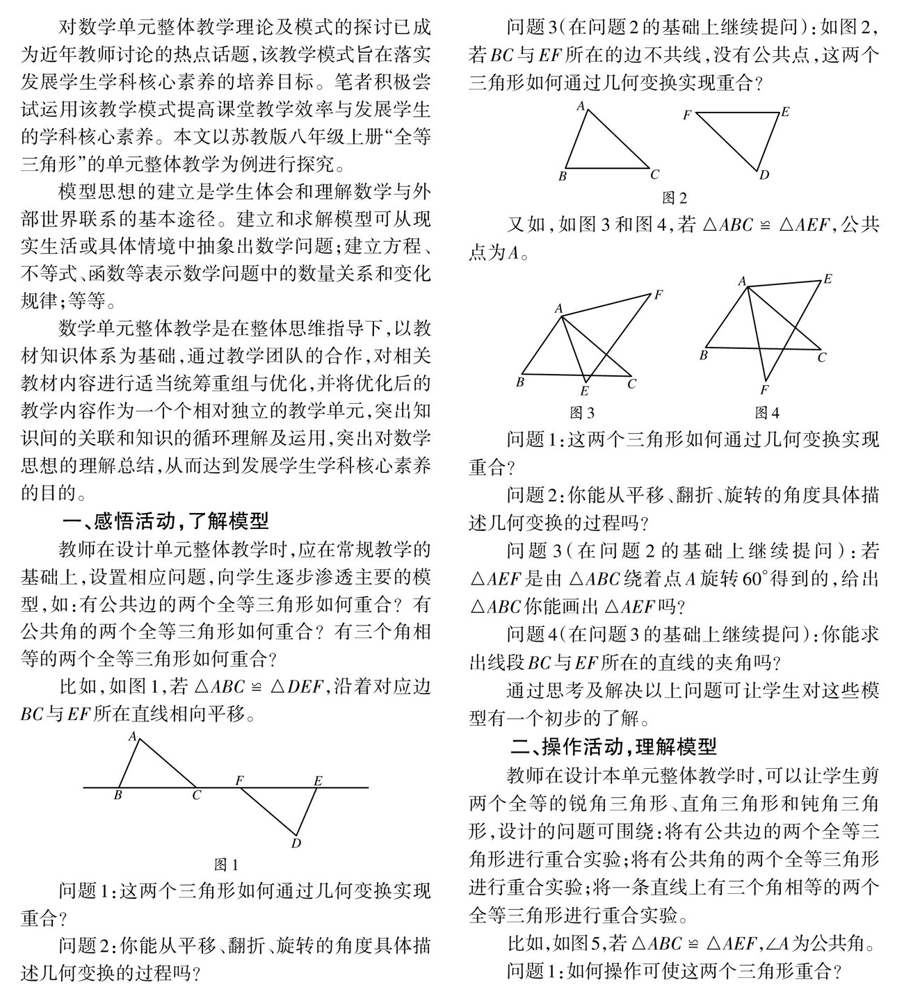 [摘 要]文章以苏教版八年级上册“全等三角形”的教学为例,重点阐述有关模型建构的单元整体教学的设计。