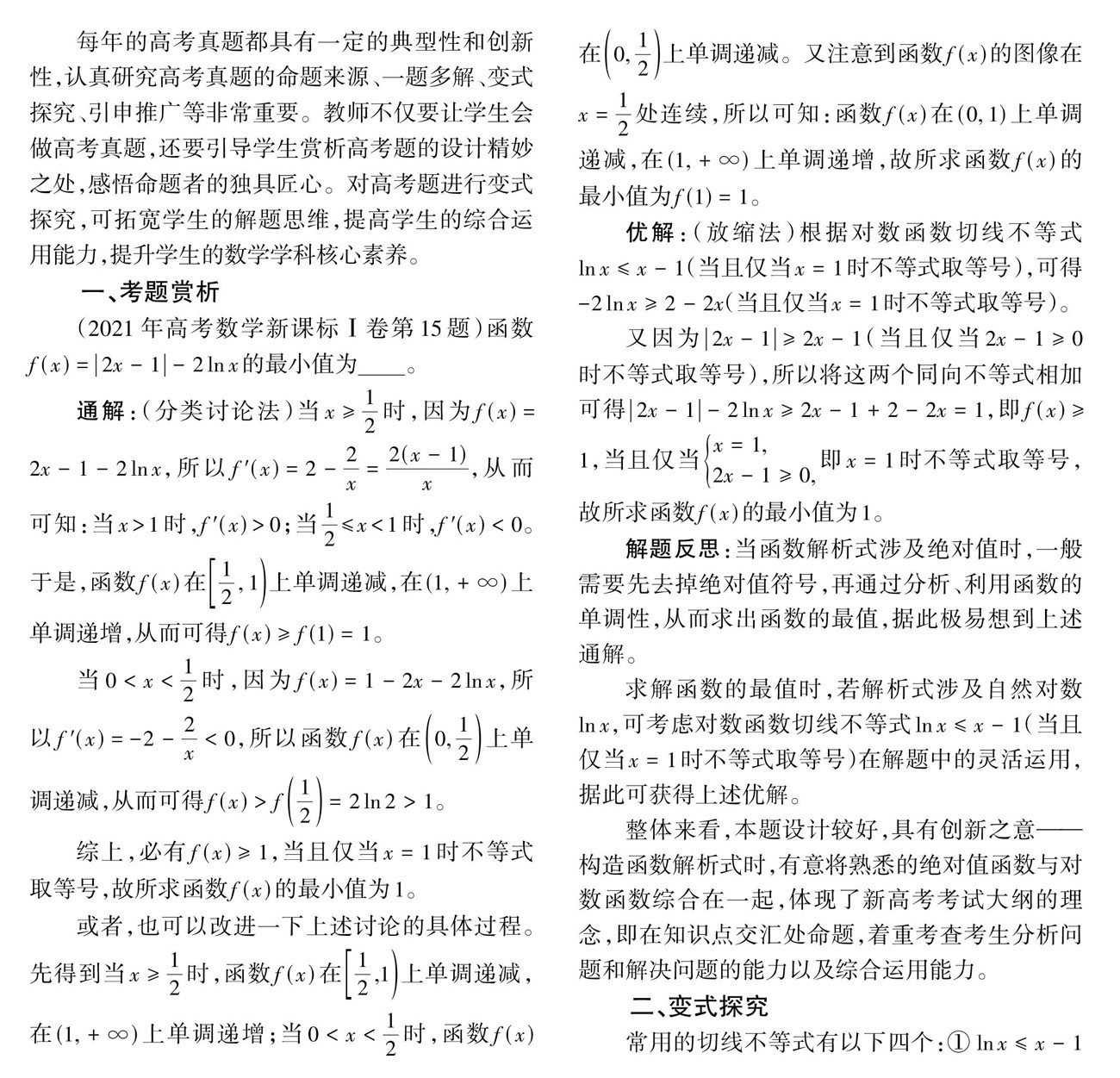 [摘 要]文章以2021年高考数学新课标Ⅰ卷第15题为例,通过一题多解、变式探究,拓宽学生的解题思维,提高学生的综合运用能力,提升学生的数学学科核心素养。