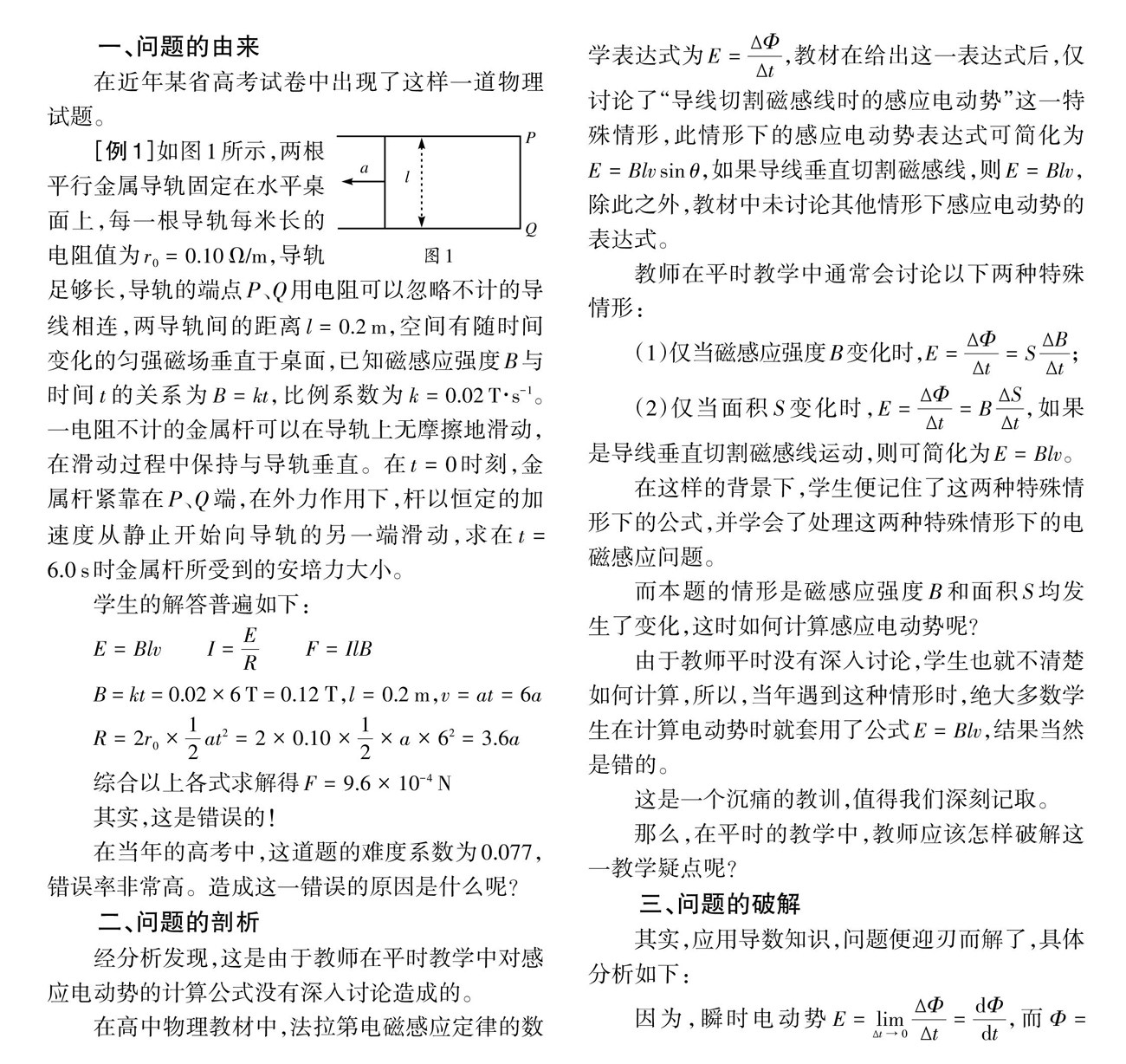 [摘 要]在高中物理“法拉第电磁感应定律”一节中,教材给出了计算感应电动势的基本公式,教师在教学中通常仅讨论两种特殊情况,一种是仅当磁感应强度[B]发生变化时的情况,另一种是仅当面积[S]发生变化时的情况,而当磁感应强度[B]和面积[S]均发生变化时,学生通常就不知道如何计算了。文章讨论学生在感应电动势计算中的一个典型错误,并提出破解方法。(剩余790字)