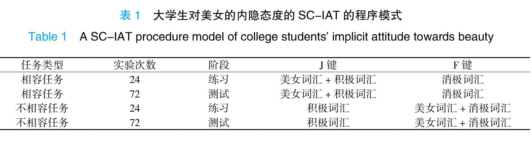 摘要|研究采用单类内隐联想测验(SingleCategoryImplicitAssociationTest,SC-IAT)测量大学生对“美女”的内隐态度。采用E-Prime2.0的编制SC-IAT实验程序,实验材料包括六个表示“美女”的词汇,属性词为六个积极词汇和六个消极词汇,所有词汇制作成图片。结果显示,SC-IAT的不相容任务的反应时显著长于相容任务的反应时,其内隐效应(D值)与0 的差异显著,可得出结论:在面称语义泛化的情况下,大学生在内隐意识层面上认同“美女”与积极品质的联结。(剩余7290字)