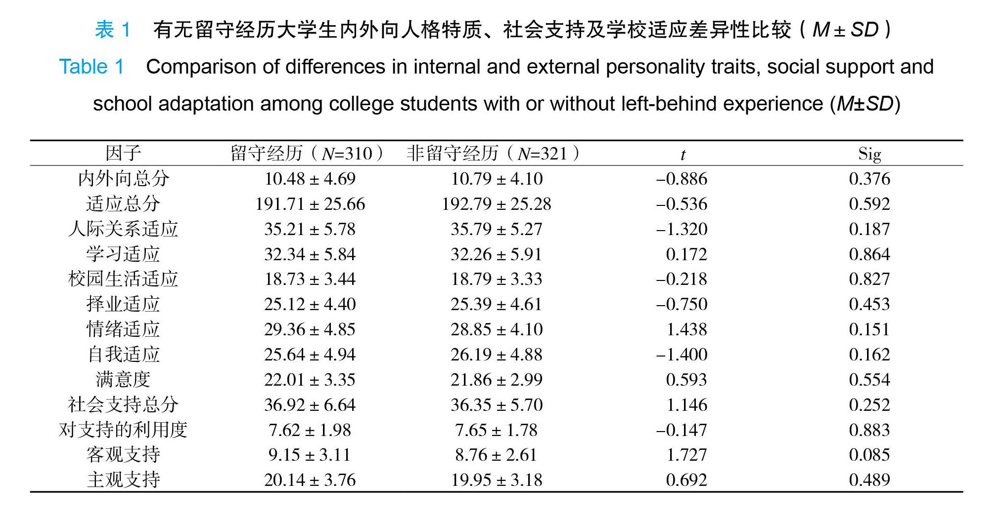 摘 要|目的:探讨留守经历大学生内外向人格特质、社会支持与学校适应的关系,为促进留守经历大学生心理发展提供参考。方法:采用中国大学生适应量表(CCSAS)、社会支持评定量表(SSRS)、艾森克人格问卷(EPQ),对上饶师范学院随机抽取的 310 名有留守经历者和 321 名无留守经历者进行问卷调查。(剩余9406字)