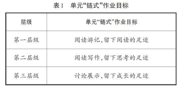 [摘 要]面对实际教学中课后作业布置类型单一、内容碎片化、目标不一致等问题,基于大单元视角,整合单元“链式”作业目标,并以具体任务为驱动,围绕单元“链式”作业目标和单篇文章的核心作业目标设计“链式”作业,并以此为支点来推动学生学习,致力于以点带面、以练促学,最终提升学生的综合能力。