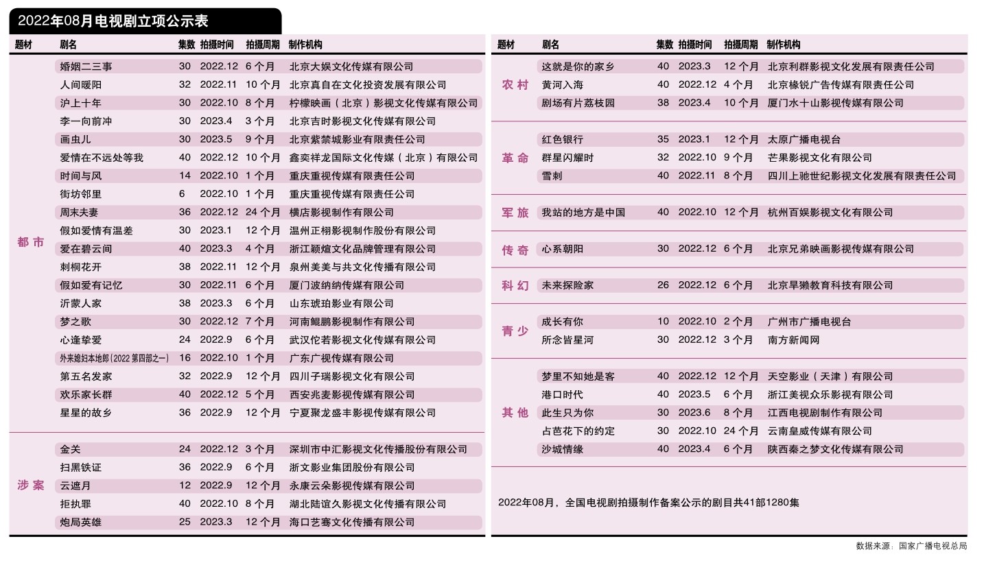 2022年8月,全国电视剧拍摄制作备案公示的剧目共41部1280集。