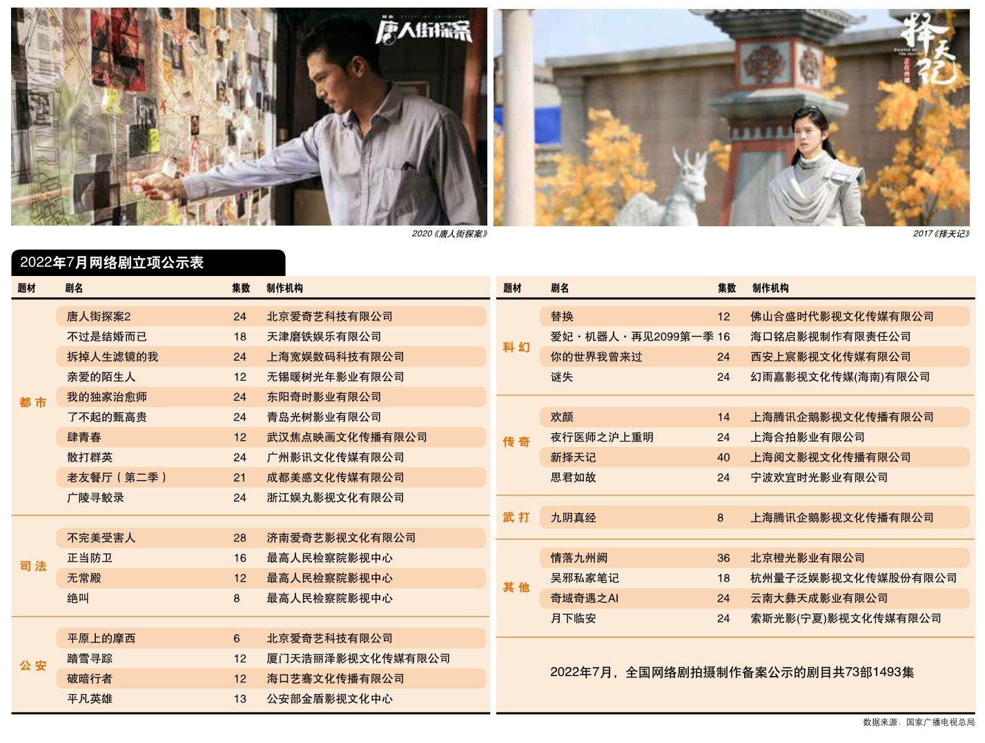 2022年7月,全国重点网络影视剧拍摄备案公示的片目共268部。其中,网络剧73部1493集,现实题材占比64%。都市题材20部427集,农村题材2部42集,青少题材1部16集,司法题材4部64集,公安题材6部71集,科幻题材5部102集,传奇题材7部178集,武打题材6部83集,宫廷题材2部44集,其他题材20部466集。(剩余997字)
