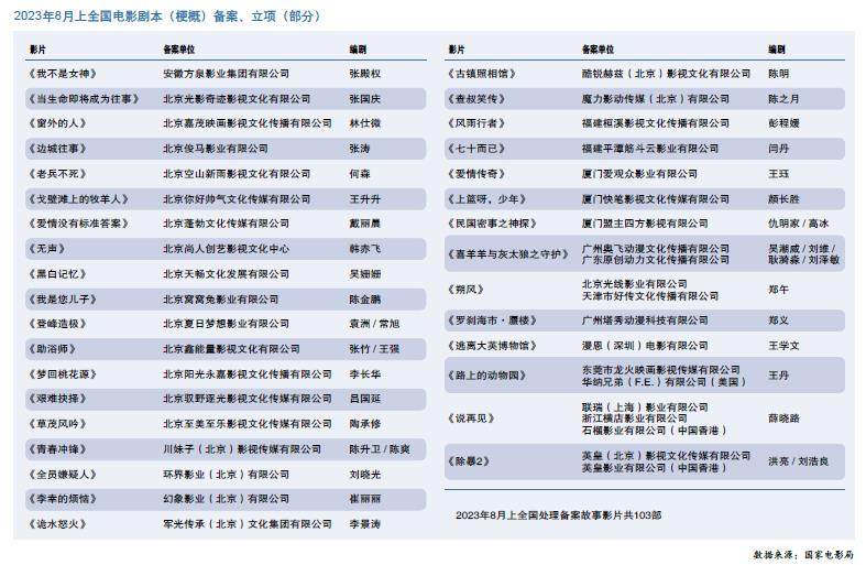 日前,国家电影局公布关于2023年8月上全国电影剧本(梗概)备案、立项信息,全国共备案故事片103部、动画片17部、中外合拍片6部。其中,《逃出大英博物馆》《罗刹海市·蜃楼》《除暴2》等电影立项。