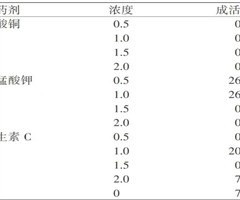 摘要 以结香萌发枝为试验材料,采用不同浓度 (0.5%,1.0%,1.5%,2.0%) 的硫酸铜溶液、维生素C溶液和高锰酸钾溶液对半木质化结香插穗基部进行浸泡处理,3个月后调查成活率、皮部生根数、愈伤组织生根数、根长、新梢长、新梢数等,分析...