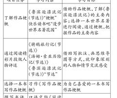 【作业目标】 1.围绕本次综合性学习的主题,参考“活动建议”和“阅读材料”,了解制作成长纪念册的基本要求和方法,制订活动计划。 2.根据活动主题,借助时间轴等形式,运用学过的方法搜集和整理反映小学生活的资料,与同学分享难忘的回忆。 3.通过...