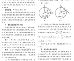 【摘要】本文通过圆中的位置关系问题,探究突破的核心有两点:一是绘制图形,直观探究位置关系;二是聚焦解析关键,比较距离与半径的大小,关注临界位置的选取.圆中位置关系问题的类型较为众多,包括常规的位置关系分析、线段取值探究,以及综合性强的复合性...