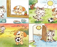 一天中午,小猫在家里正洗着碗小熊来到小猫家的窗户边,举起手敲了敲窗户,微笑地说:“小猫,你在家干什么呢?”小猫说:“我正在洗碗。你有什么事吗?”小熊说:“等你洗好碗,我们一起去踢足球吧。”小猫听见“踢足球”三个字,立马来了兴致,急急忙忙地洗...