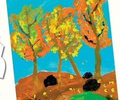 《金色银杏》 四川省邛崃市红番茄美术馆 唐梓睿(9岁) 指导老师:周润年 点 评 或黄或红的树叶和地上零星的落叶,让人感受到浓浓的秋意。这幅绘画主题突出,大面积的蓝色、褐色和绿色,分别表现蓝天、大地和草丛;橘色和黄色则生动地展现了银杏叶...