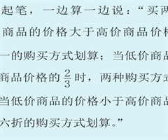 十一假期,爸爸、妈妈准备带我去苏州的一家儿童乐园游玩。可是原本高高兴兴的出游却在是“自驾游”还是“跟团游”上犯了难,妈妈认为跟团游便宜,爸爸认为自驾游方便。 我对爸爸妈妈说:“你们把两种出行方式的费用告诉我,我来帮你们算算,如果费用差的不多...