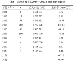 [摘要]目的分析2011—2020年北京市昌平区麻疹流行病学特征,发现麻疹发病的重点地区和高发人群,为麻疹的科学防控提供参考依据。方法以北京市昌平区2011年1月至2020年12月确诊的585例麻疹患者作为研究对象,采用描述流行病学方法分析...