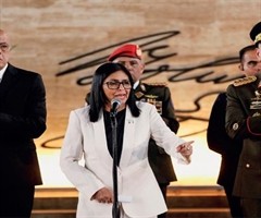 1月8日,委内瑞拉加拉加斯,代总统德尔西·罗德里格斯(中)在英雄烈士晋升及授勋仪式上发表讲话,悼念在美方绑架马杜罗夫妇事件中牺牲的委内瑞拉和古巴军警人员。左为全国代表大会主席豪尔赫·罗德里格斯,右为国防部长洛佩斯。 委内...