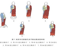 内容摘要:传统的佛衣与僧衣主要由三衣构成,即大衣、上衣、下衣,此外还常着僧祇支(唐称“掩腋衣”)。伴随北齐法上改革,佛像和弟子像都出现了新的法服披覆方式——内着僧祇支、上衣覆搭双肩、大衣右袒式披覆。这种披覆方式在甘肃、河南、四川等地的部分弟...