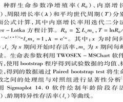 摘要:采用生命表分析法对比氟啶虫胺腈亚致死浓度对棉蚜和棉长管蚜种群生命表参数的影响。结果表明,氟啶虫胺腈LC20(1.02 μg/mL)处理棉蚜后G0代种群表现出种群净增值率(R0)降低,平均世代历期(T)缩短和种群加倍时间(DT)延长,但...