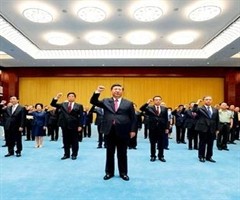 国内 6月18日,党和国家领导人习近平、李克强、栗战书、汪洋、王沪宁、赵乐际、韩正、王岐山等在中国共产党历史展览馆参观“‘不忘初心、牢记使命’中国共产党历史展览”。图为参观结束后,习近平带领党员领导同志一起重温入党誓词。(新华社记者 李学仁...