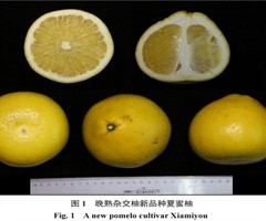 摘要:夏蜜柚是由清见橘橙×沙田柚杂交选育出的晚熟柚类杂种。果实阔卵圆形或锥状卵圆形,果顶端平,果面黄橙色,单果质量610 g,果肉浅橙色,中心柱充实,无核或少核。成熟时果实的可滴定酸含量(w,后同)0.47%,可溶性固形物含量12...