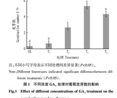 摘要 以巨峰葡萄为研究对象,采用不同赤霉素浓度对巨峰葡萄枝条冬芽进行处理,观测冬芽萌芽时间及萌芽率,测定葡萄冬芽可溶性糖含量在各处理中的变化。结果表明, 50和100 mg/kg的赤霉素对提前打破葡萄休眠的作用比10 和25 mg/kg赤霉...