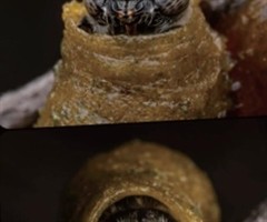 澳大利亚树脂罐蜂因其用树脂建罐状“育婴房”而得名。树脂罐蜂的雌蜂用树脂或嚼碎的树叶制作自己的茧,并将这些茧悬挂在树枝和树干上。雌蜂为每个茧准备花粉团作为幼虫食物来源,然后它在每个茧内产下一枚卵,并封住入口,只保留一个通气孔,以保护里面发育的...